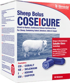 CoseIcure Sheep Bolus is a unique, soluble glass trace element bolus for sheep, which delivers rumen-available ionic copper, ionic cobalt, iodine and selenium to the animal at a controlled and constant rate for up to eight months.